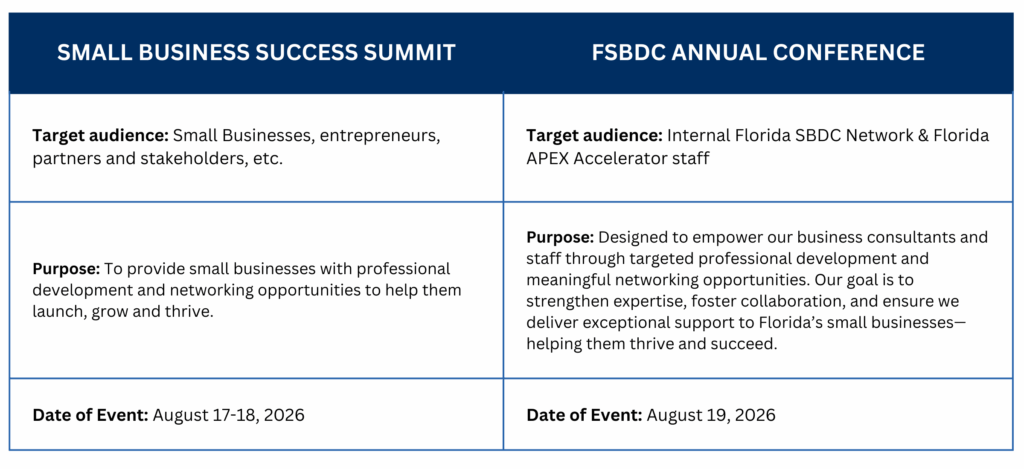 The Florida Small Business Development Center (SBDC) Network is pleased to announce the call for presentations for the 2026 Small Business Success Summit, as well as the network's internal Annual Professional Development Conference. Both events will be held at the Sunseeker Resort in Charlotte Harbor. Details about each event are below: